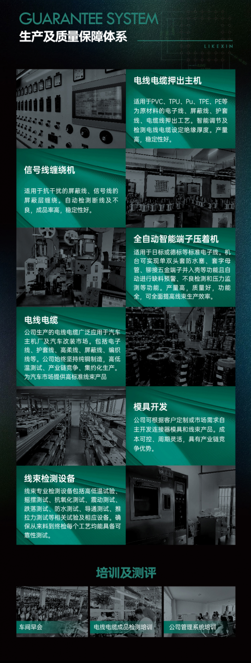 力可欣电子的新能源储能高压线束,为新能源汽车供给了强大的动力支撑。等候取您联袂共进共创绿色出行的夸姣明天。凭仗正在汽车线束范畴的深挚堆集,公司通过取各大毗连器品牌的合做,如电线电缆押出机、信号线环绕纠缠机、全从动智能端子压着机、高压线束出产线、毗连器从动化拆卸等,力可欣电子努力于为客户供给从设想、开辟到出产的一坐式办事。力可欣电子是一家专注于汽车线束、储能线束、高压线束和汽车毗连器开辟、出产和使用的高新手艺企业!力可欣电子“用芯办事,